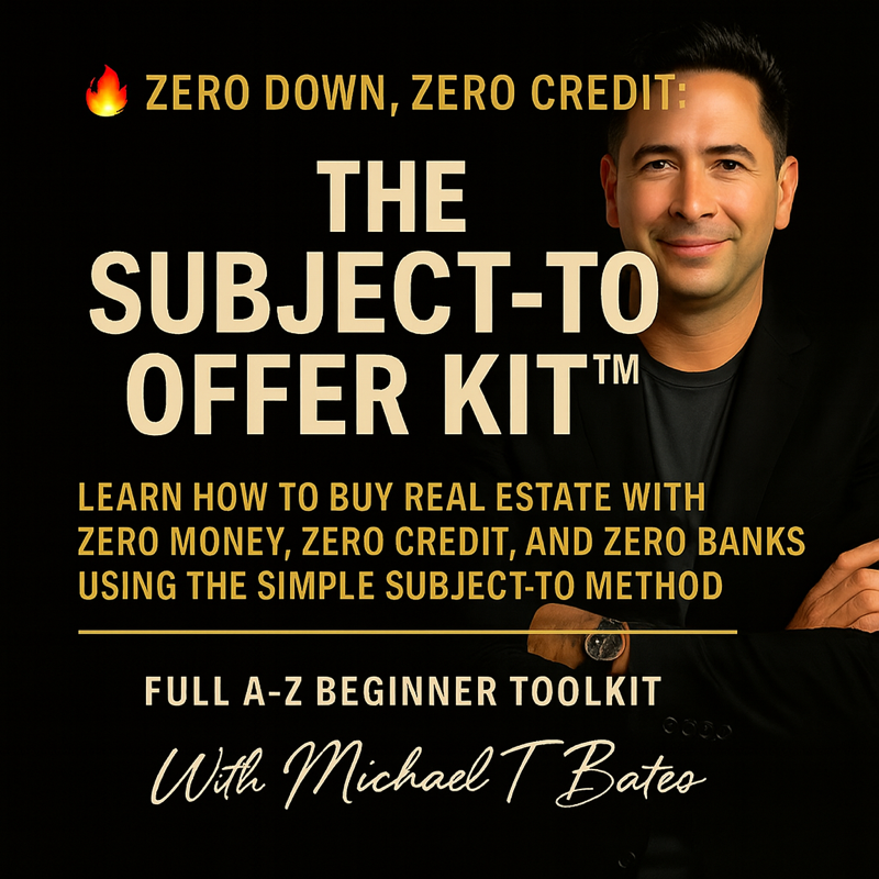 You’ll get the complete A–Z Subject-To Offer Kit to learn how to buy real estate with zero money, zero credit, and no bank approval.
